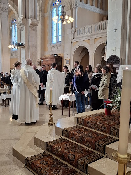 Le 11 janvier, dimanche de la fête du baptême du Christ, ont été accueillis à l’église Notre Dame 11 catéchumènes adultes qui avec leurs accompagnateurs commencent un chemin vers le baptême. Ils sont nés entre 1958 et 1990 avec une majorité de trentenaires. Symboliquement le groupe attendait devant la grande porte de l’église qui s’est ouverte en signe d’accueil par la communauté paroissiale rassemblée pour la messe. Avec leurs accompagnateurs ils se sont avancés jusque dans le chœur où ils se sont présentés avant de recevoir l’onction de l’huile des catéchumènes et la bénédiction. L’un d’eux sera baptisé au cours de la veillée pascale de cette année, les 10 autres le seront l’année prochaine. Pour la messe se sont joints à eux les fiancés de l’année en réunion de préparation au mariage au vieux moulin.